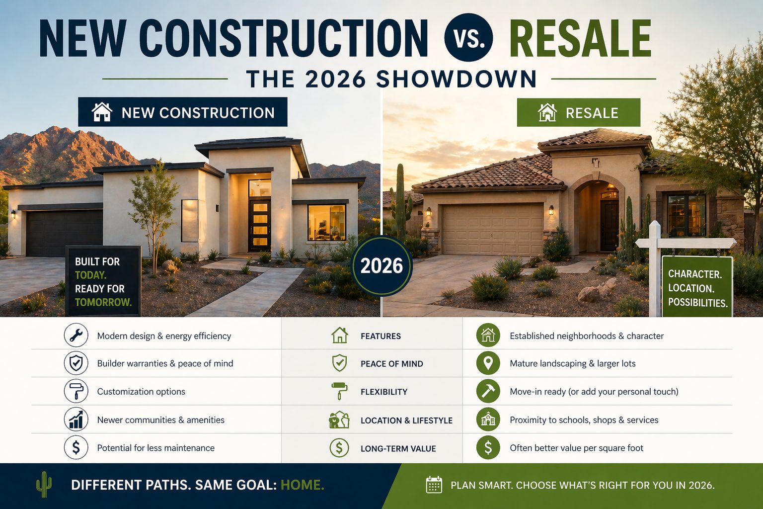 Should you buy a new build or a resale home in Arizona in 2026? New builds currently offer superior financing, with some builders providing interest rates in the 3%–4% range through preferred lenders. Resale homes offer larger lots, mature landscaping, and established neighborhoods.